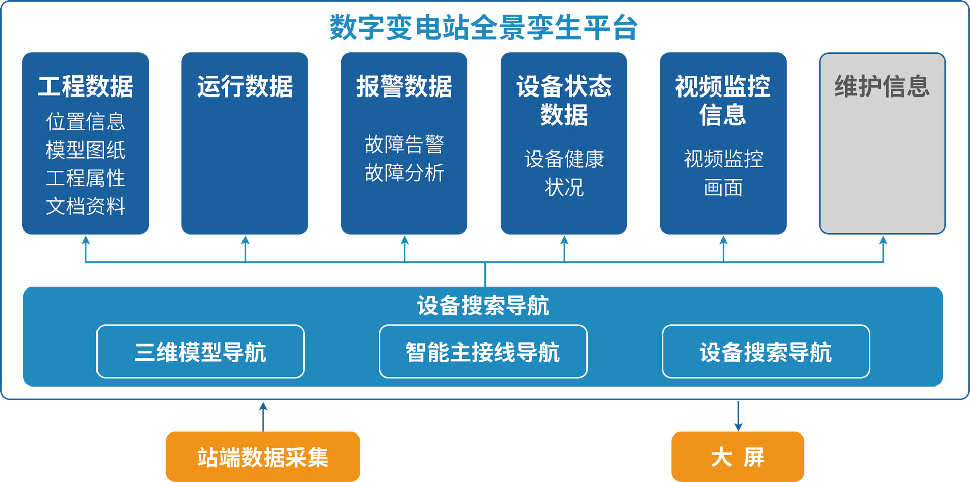 平台实现实时运行数据可视化、实时报警信息可视化、设备健康信息可视化、智能巡检等功能。通过三维模型导航、智能主接线导航、设备搜索导航三种方式,从一个视图中管理监测对象并展示相关关联数据。